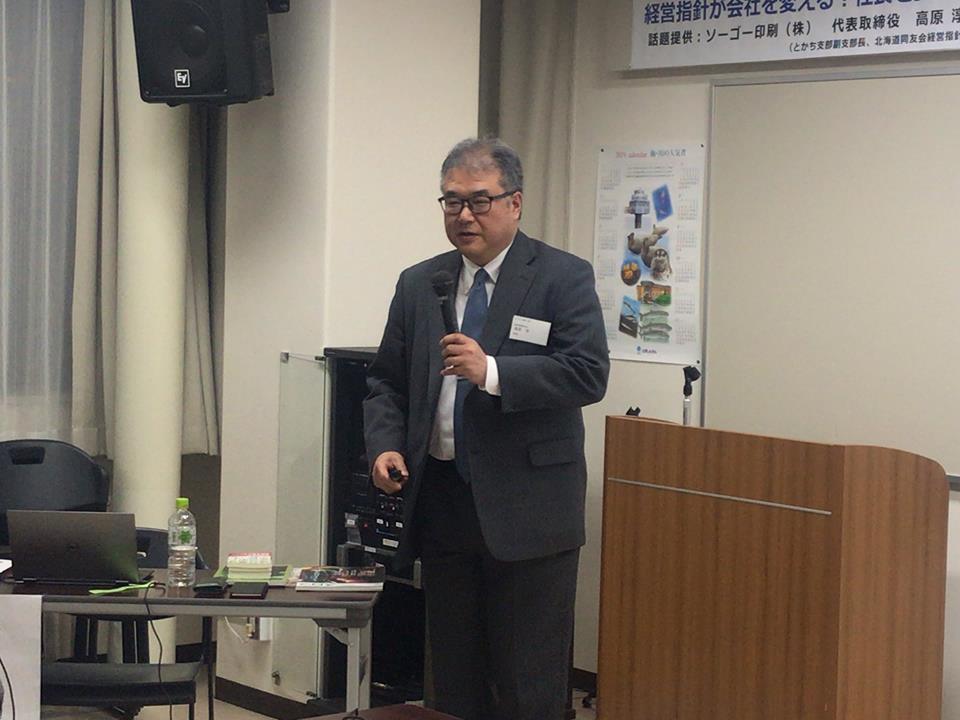 全道経営指針委員長でもあり、帯広で情報誌「月間しゅん」や雑誌「スロウ」などを手掛けるソーゴー印刷(株)の高原淳社長をお招きし、「経営指針が会社を変える!社長を変える!」をテーマに話題提供。自身の経営実践を交えながら経営指針成文化の必要性についてお話いただきました。